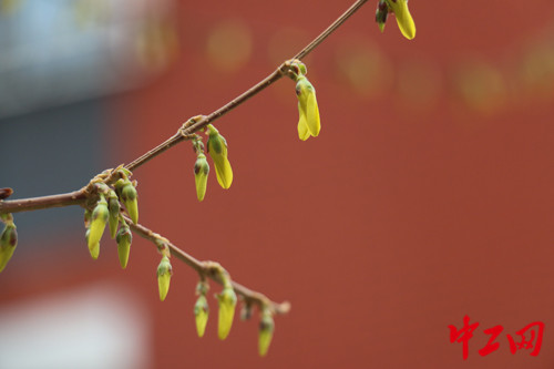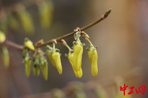 连翘花含苞待放,纤细的枝丫上,缀满了一朵朵金灿灿的花骨朵儿。中工网 刘云摄