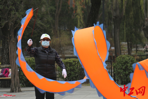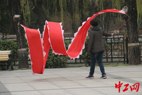 青年湖公园内,一位大妈跟随音乐节奏挥臂舞动彩带,划出美丽的圆弧。中工网 刘云摄