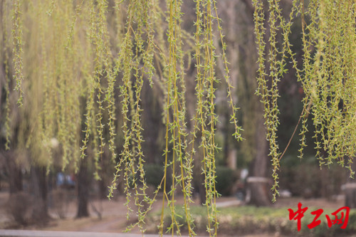 湖边的柳树发芽了,青翠欲滴,柔软的柳枝随风飘扬。中工网 刘云摄