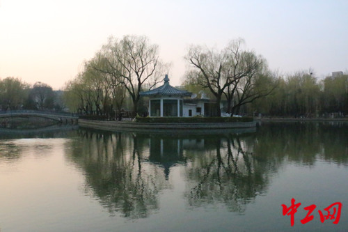 青年湖公园湖心岛及周围的绿树倒映在湖面,像是一幅浓淡相宜的水墨画。中工网 刘云摄