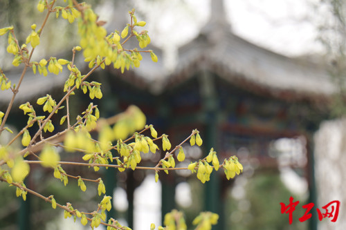 北滨河公园内,迎春花在公园古亭的衬托下显得格外美丽。中工网 刘云摄