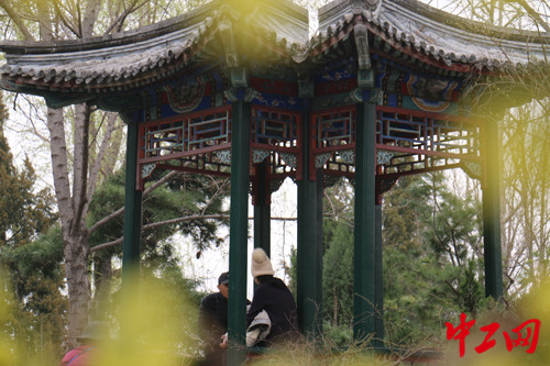 北滨河公园内,记者在迎春花丛中拍摄古香古色的小亭子,游客坐在亭子里观赏公园的美景。中工网 刘云摄