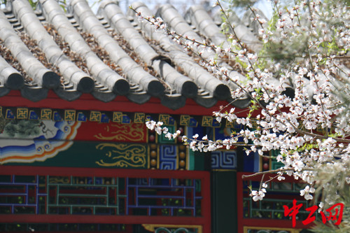 北二环城市公园内,枝上桃花与古建筑相映成趣,一派春日景象。中工网 刘云摄