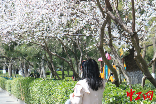 北二环城市公园内,桃花灼灼满树盛开,路过的游客纷纷驻足停留,拍照留影。中工网 刘云摄