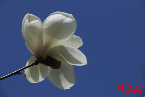 北二环城市公园干净整洁的小路两边盛开着满树的白玉兰花,白色玉兰花在蓝天的衬托下,显得更加洁白无瑕。中工网 刘云摄