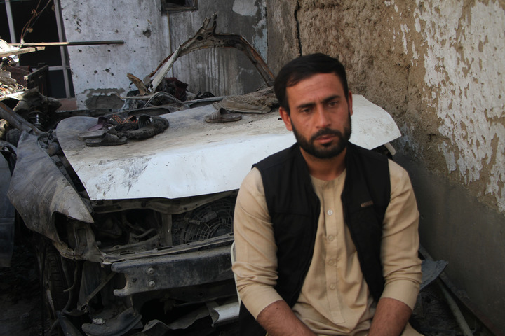 2021年9月18日,在8月29日被美军无人机袭击的阿富汗喀布尔居民区,遇难者扎玛赖的弟弟哈米迪坐在汽车残骸前。美国军方9月17日承认,美军8月29日在阿富汗首都喀布尔实施的无人机袭击造成当地10名平民死亡,其中包括7名儿童。新华社发(塞夫拉赫曼·萨菲摄)