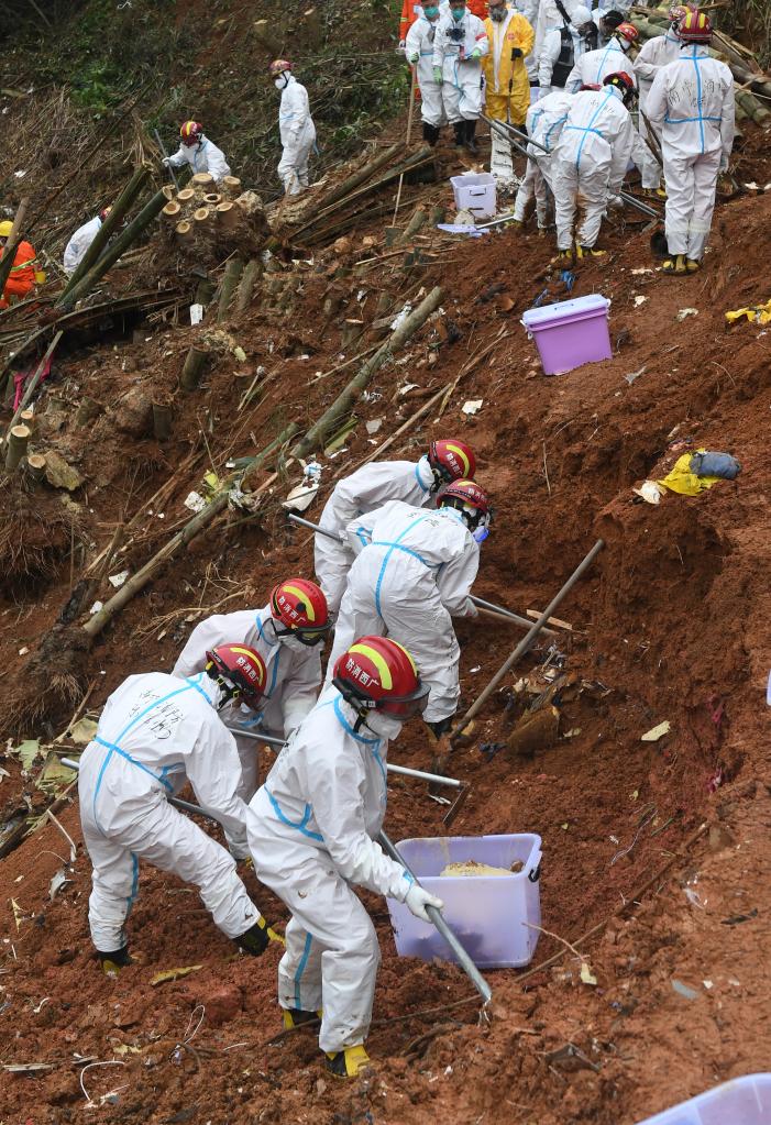 3月27日,搜寻人员在东航MU5735航班坠机事故现场发现第二部黑匣子的地方进行清理。新华社记者 陆波岸 摄