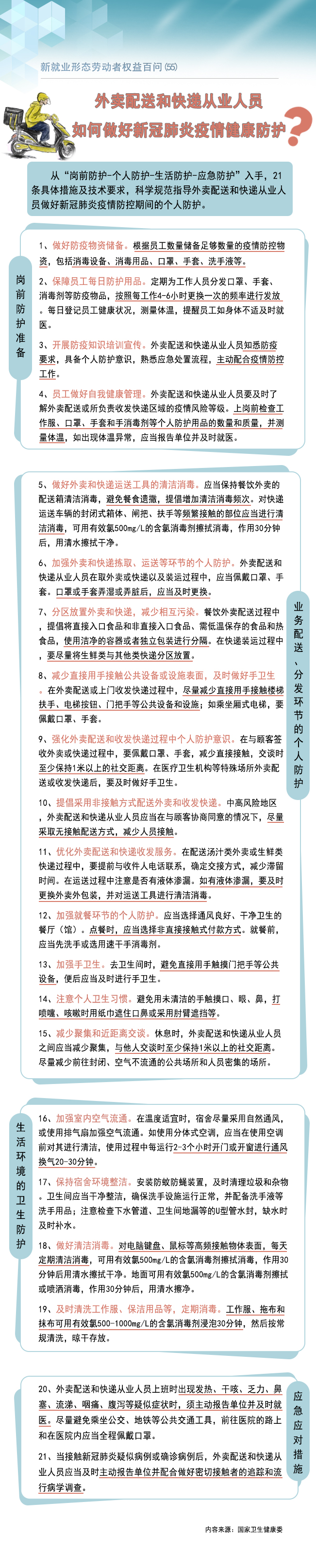 【新就业形态劳动者权益百问(55)】外卖配送和快递从业人员如何做好新冠肺炎疫情健康防护?