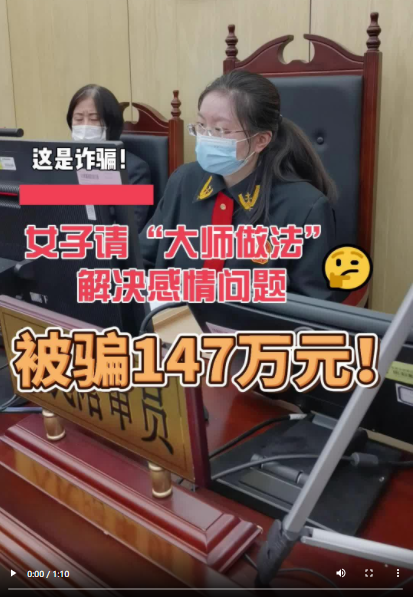 2999元做一次“斩桃花”法事;任何事情都可以问事占卜,一个问题188元……女子盖某请“大师”算命做法事,半年多时间里盖谋转账400多次,被骗共计147万元。4月1日,北京市西城区人民法院审理了这起“大师”诈骗案。所谓“大师”也因犯诈骗罪分别被判处有期徒刑10年、5年。