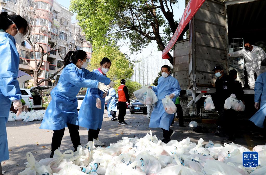 4月3日,在上海闵行区七宝镇一个封控居民小区内,社区志愿者们将生活物资派发到居民楼下,方便居民逐户下楼领取。