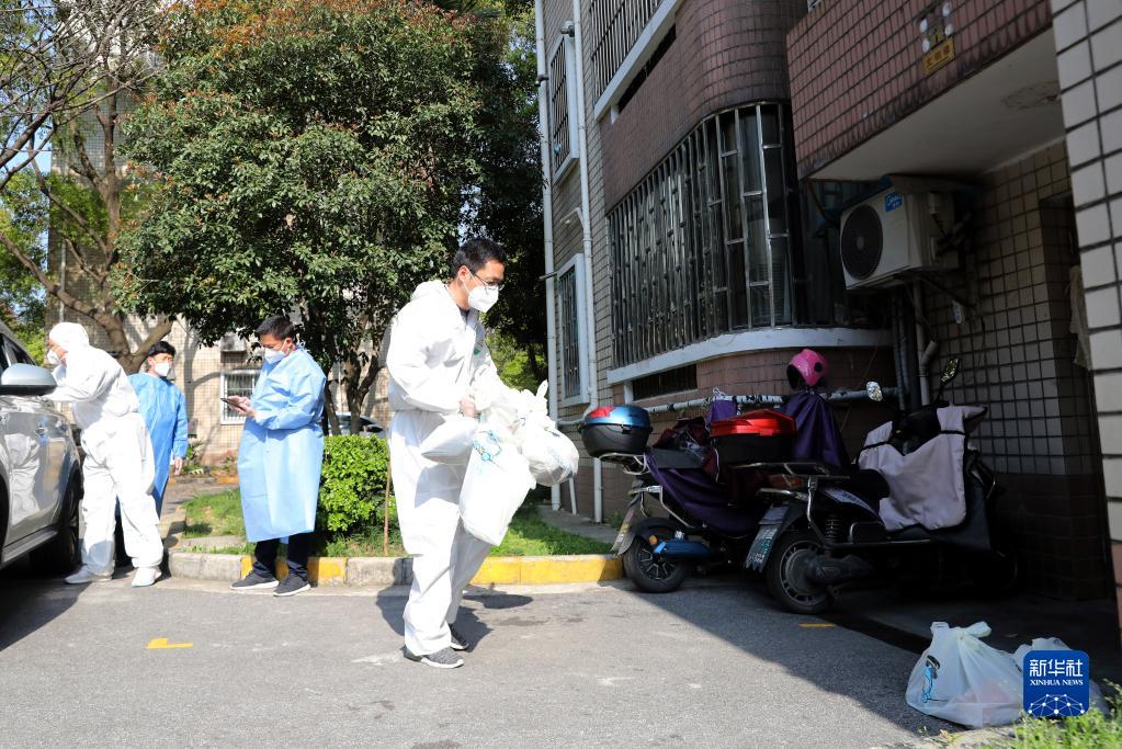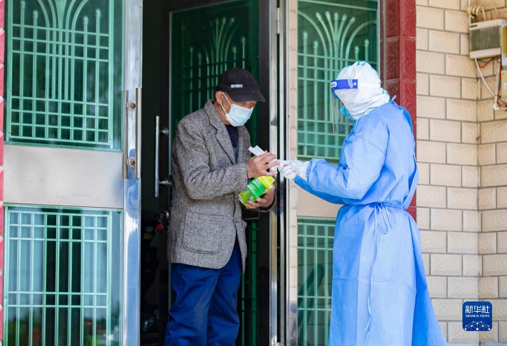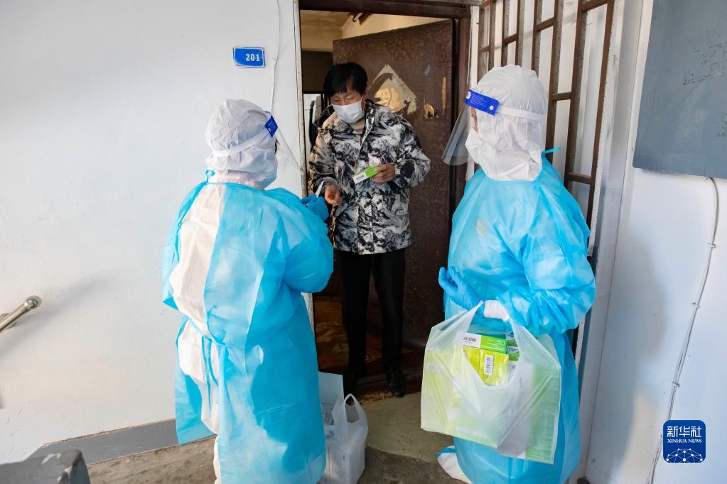 4月3日,在上海奉贤区柘林镇新寺社区,社区志愿者上门为居民送抗原检测试剂。