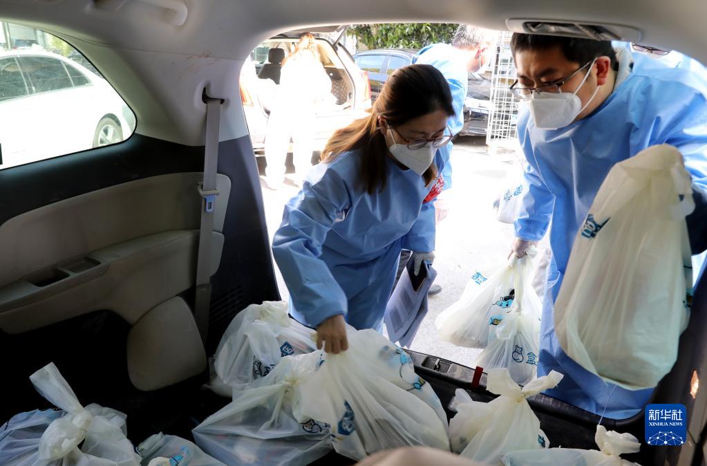 近日来,为配合全市核酸筛查工作,上海的部分居民小区实施封控管理。在这些小区内活跃着许多由居民组成的志愿者服务队伍,他们的日常工作包括派发生活物资、接收派送居民快递外卖和辅助核酸筛查等,助力疫情防控。新华社发(石俊 摄)