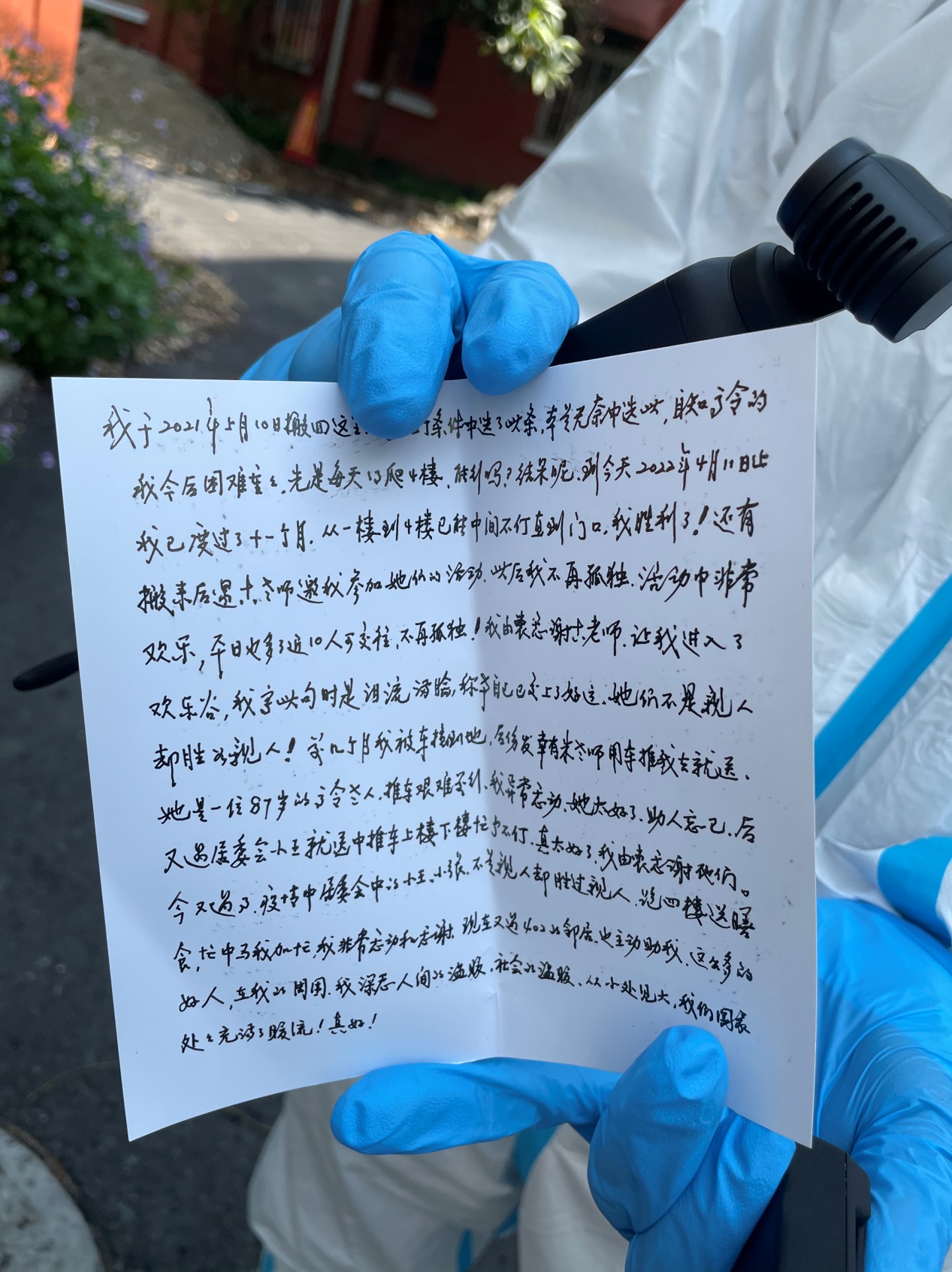几经推辞,钱留在老人家手里,但她还执拗地递来两封信,一封短的,本来包钞票用的:这是给您们和广大志愿者添些营养品用,望勿拒。还有封长信里提到,“疫情中,居委会的小王、小张,不是亲人却胜过亲人,跑四楼送膳食,我非常感谢。”