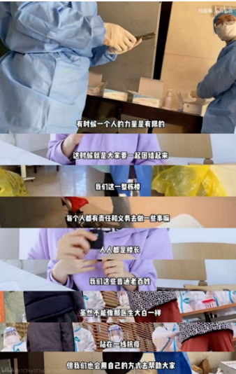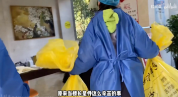 视频中的拉宏穿着防护服,拎着两个到腋窝的塑胶袋,在大厅和楼层之间穿梭,时不时被不熟悉的工作人员嘱咐:“不懂你就问楼组长”,她心说:我就是楼组长!