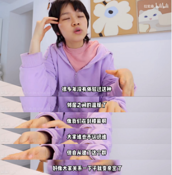 隔壁的阿姨给她送来了三块羊排,拉宏桑非常感动;去居民家时硬要拉她喝碗糖水,广东妹子也觉得十分亲切。她很为自己这栋楼骄傲:很多居民都会把自己家富裕的食物拿出来,让其他邻居按需自取;楼里谁家少袋盐少根葱,群里喊一声马上就有人应。