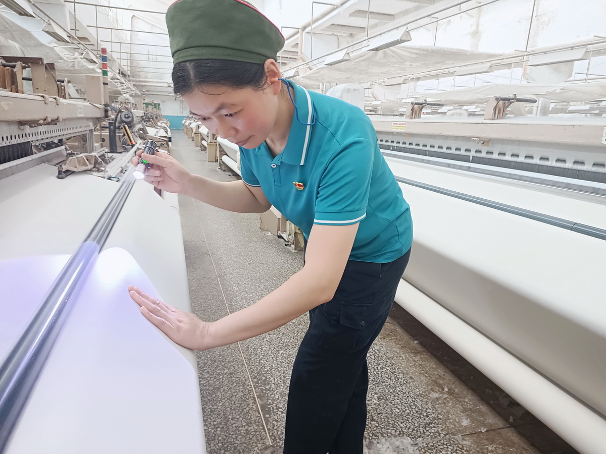 有人说,能走到织布车间质量管理岗位,都是靠技术实力说话。李会菊在工作岗位上20多年,她不仅仅操作技术过硬,每分钟可打结36个,更是练就了“火眼金睛”和“手摸感应”控制布面质量的能力。
