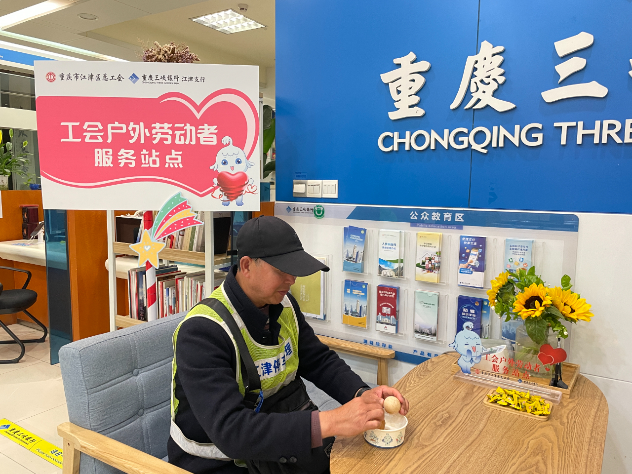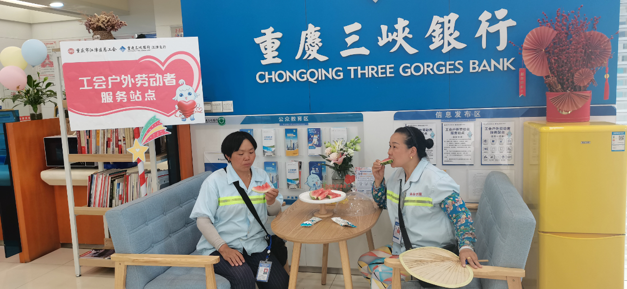 “渴了就来喝杯水,身体不舒服了,还可以吃一支藿香正气液,工会组织替我们职工想得很周到。”4月17日上午,在位于重庆三峡银行江津支行的工会劳动者户外驿站,负责道路停车管理的周大姐如是说。