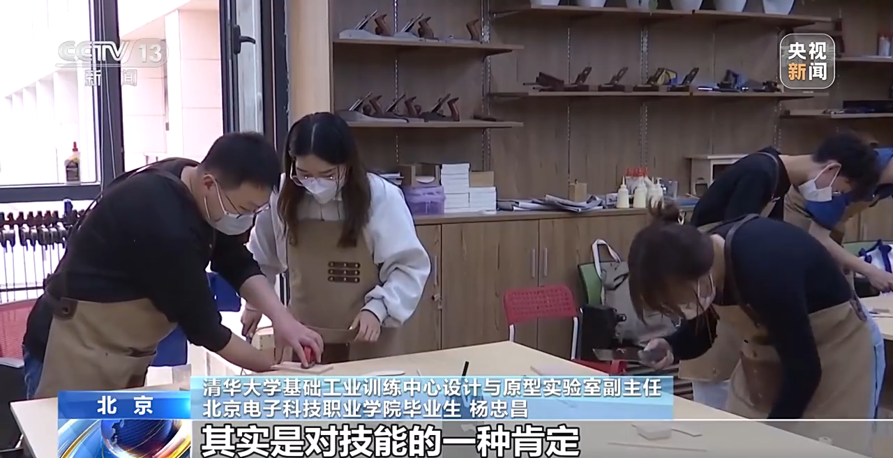 清华大学基础工业训练中心设计与原型实验室副主任 北京电子科技职业学院毕业生 杨忠昌:我们职业院校毕业的同学在训练中心占比是三分之一,走工程技术系列,工资待遇和上升的空间,它有一个很好的平台,其实是对技能的一种肯定。