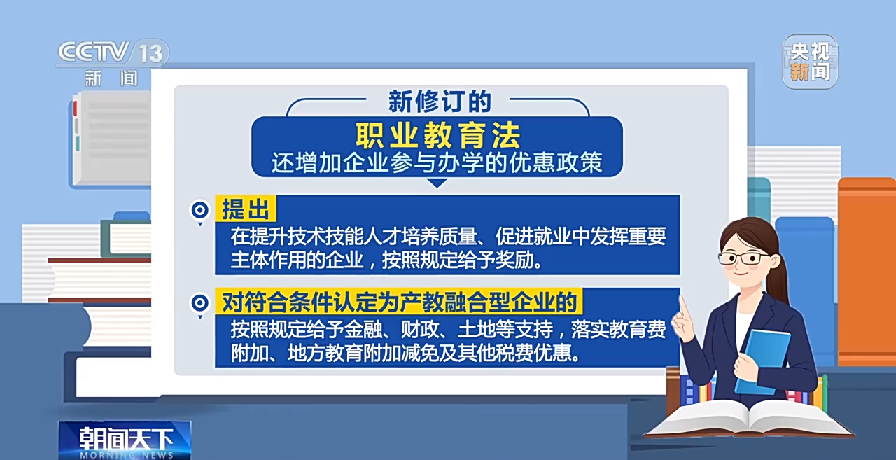 此外,新修订的《职业教育法》还增加了企业参与办学的优惠政策,比如,提出在提升技术技能人才培养质量、促进就业中发挥重要主体作用的企业,按照规定给予奖励;对符合条件认定为产教融合型企业的,按照规定给予金融、财政、土地等支持,落实教育费附加、地方教育附加减免及其他税费优惠。