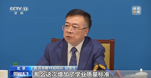 教育部教材局局长 田慧生:过去我们的课程标准对教到什么程度,没有系统明确的规定。那么这次增加了学业质量标准这一个部分之后,对教师在教学中教到什么程度,或者说对学生学到什么程度,这个掌握到什么程度就达到了相应的要求,在这个部分做出了全面的系统规定,这样就可以有效地防止和避免在实际教学中学得过多,学得过难,就是过去我们讲到的超出标准要求 人为地 有时候加大了教学的难度、深度。