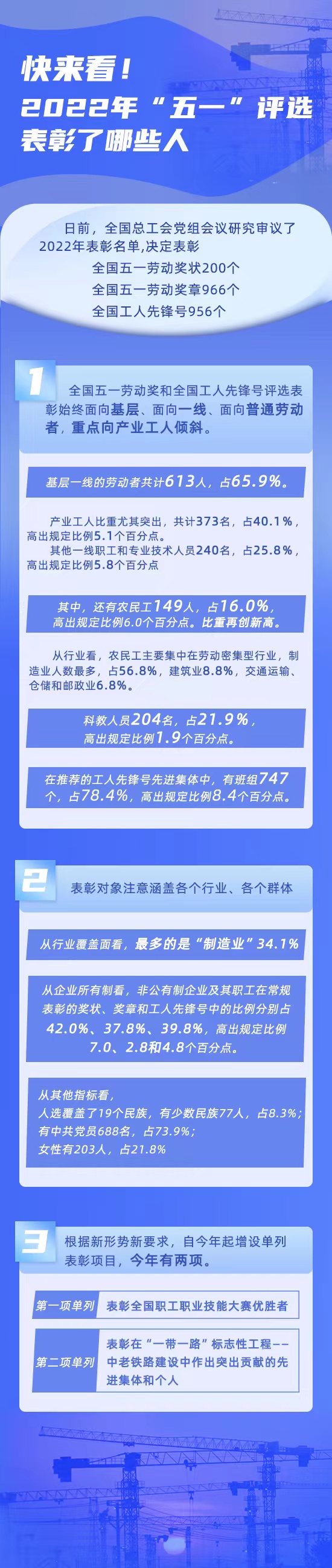 4月25日,全国总工会发布《2022年“五一”评选表彰工作答记者问》。日前,全国总工会党组会议研究审议了2022年表彰名单,决定表彰全国五一劳动奖状200个、全国五一劳动奖章966个、全国工人先锋号956个。