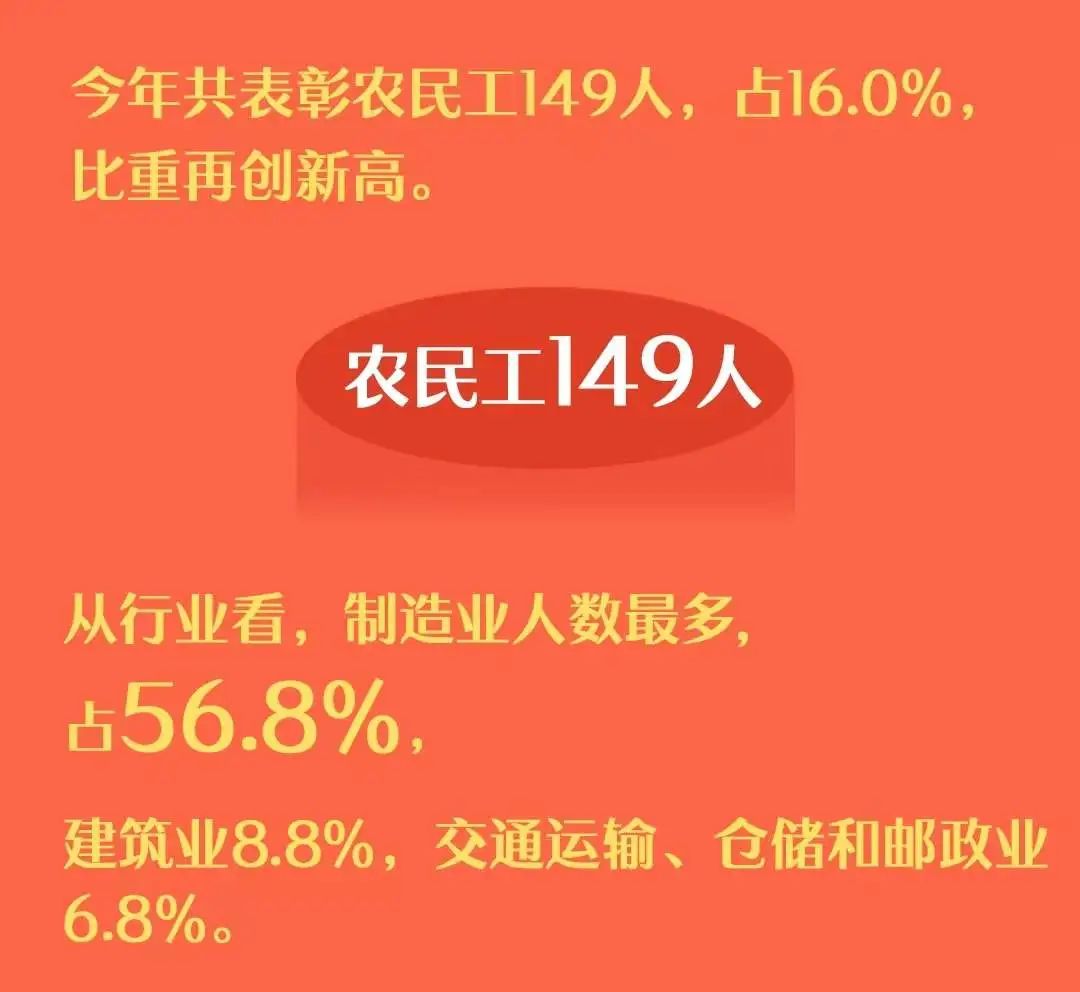 今年共表彰农民工149人,占16.0%,比重再创新高。