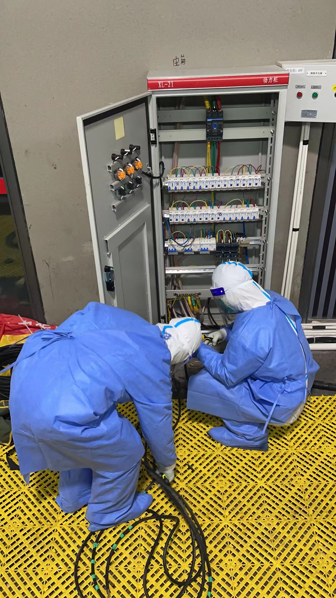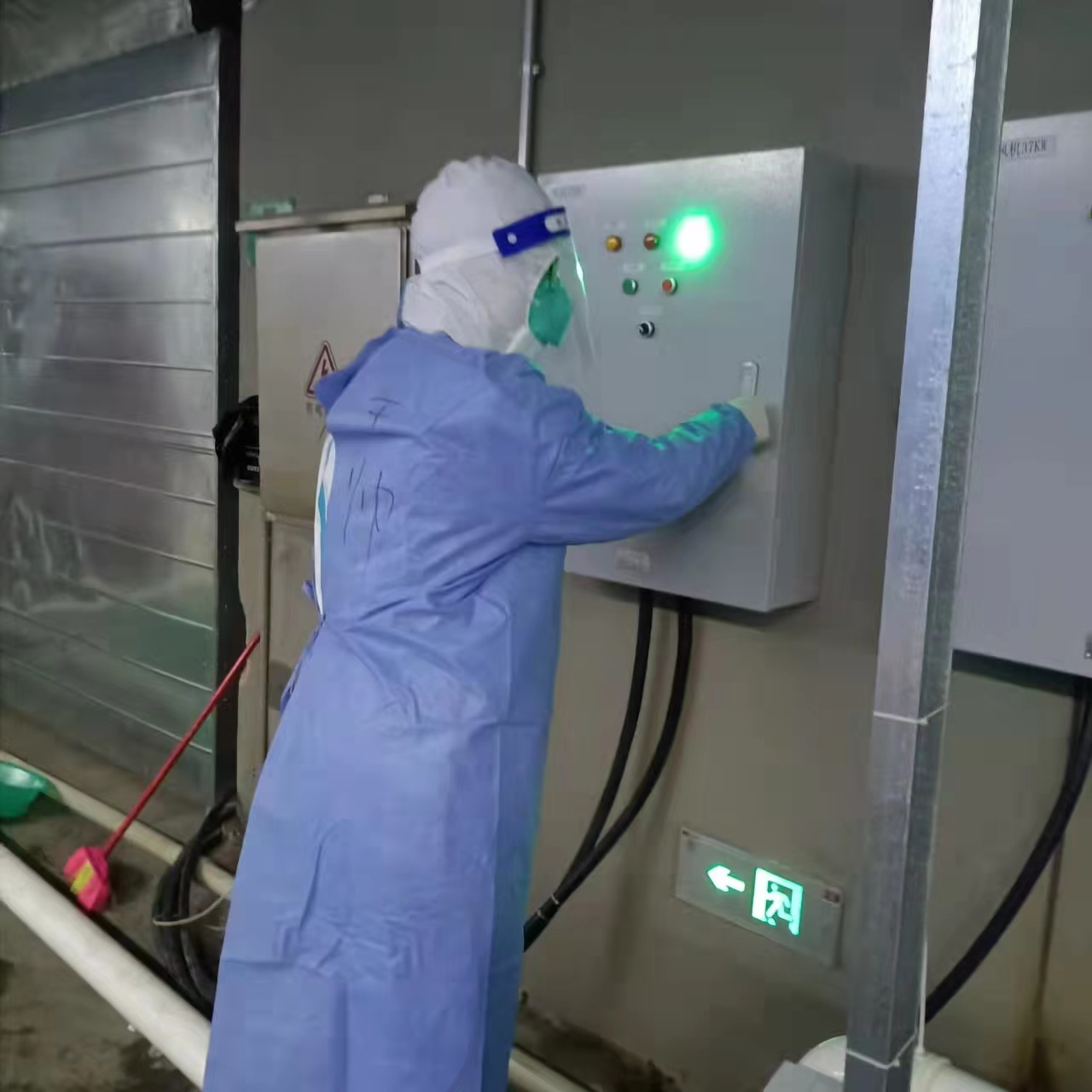 4月10号的下午五点,上海公司接到维保任务;六点半,所有人员在国展中心门口集结完毕。晚上七点钟,维保队员经过短暂的防疫措施培训,穿戴好防护用品投入工作。