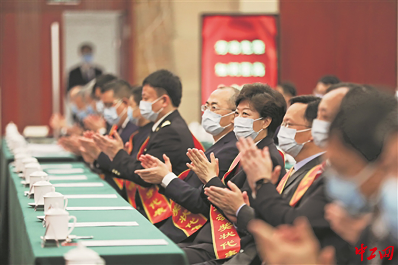 4月28日,2022年庆祝“五一”国际劳动节暨全国五一劳动奖和全国工人先锋号表彰大会以电视电话会议形式在北京召开。大会结束后,部分在京的获奖代表在会场留影。
