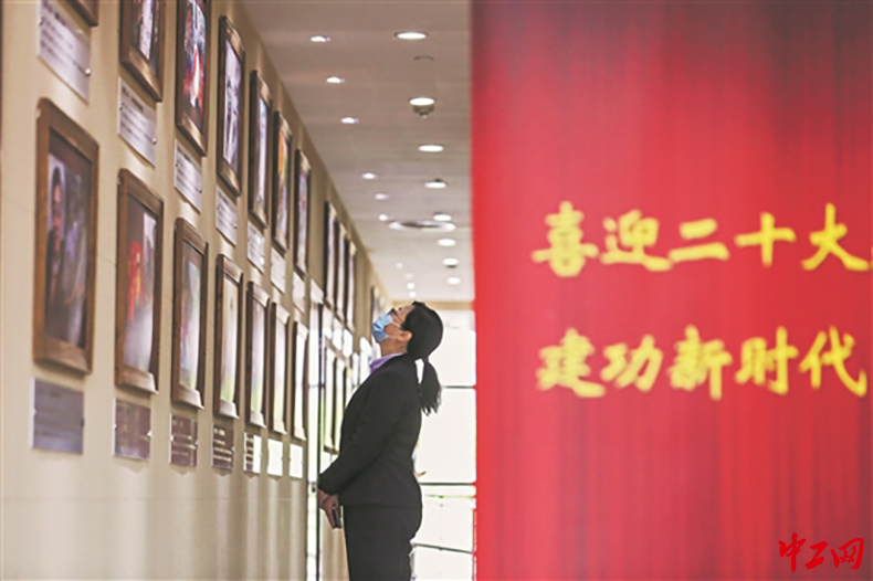 4月28日,中国职工之家,一名工作人员在观看会场外的劳模图片展。