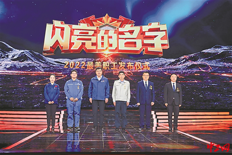 4月22日,北京,在2022年“最美职工”发布仪式上,入选者上台领奖。