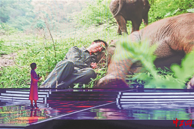 4月22日,2022年“最美职工”发布仪式上,西双版纳野象谷景区有限公司亚洲象救护与繁育中心经理、兽医师、农艺师熊朝永未能到达北京录制现场,大屏幕上正播放他与亚洲象互动的视频。