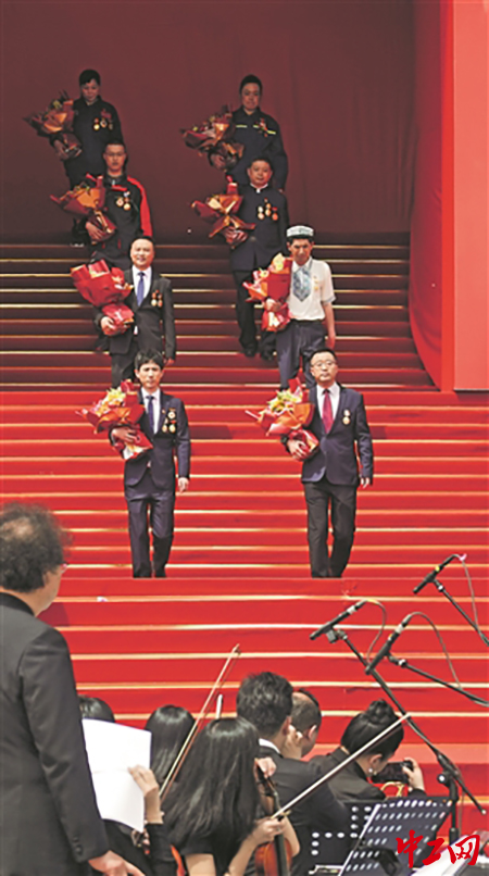 4月28日,庆祝大会开始前,工作人员为一位获奖代表整理工装。