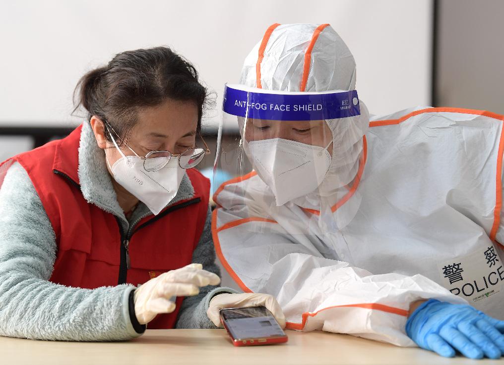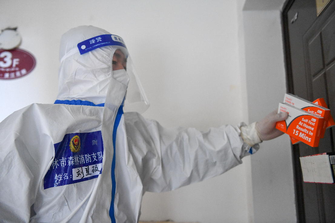 ↑2022年4月8日,在吉林市丰满区中环滨江花园小区,刘星硕为居民送抗原检测试剂。自3月3日吉林市森林消防支队接到上级命令,即刻深入社区、村屯以来,25岁的刘星硕与队友们一起变身“大白”,坚守抗疫一线。与灭火作业不同的是,抗疫一线的工作需要更多耐心与细致。每天天不亮出发,入夜才归队。消杀、送菜、递送防疫物资……命令到哪,刘星硕和队友们的岗位就设到哪里。