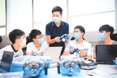 2020年7月14日,“80后”创业者吴以航(中)在澳门青年创业孵化中心为学生上培训课。 新华社记者 张金加 摄
