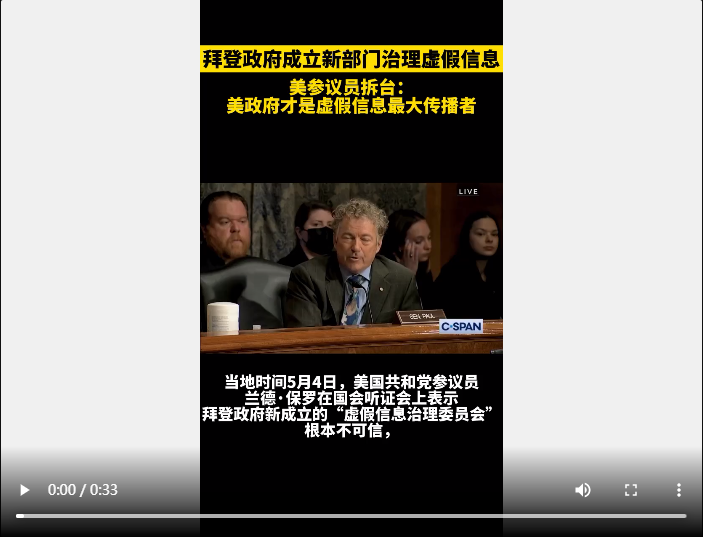 【环球网报道 记者 乔炳新】拜登政府刚成立新部门没多久,就有人当众拆台了。据俄罗斯卫星通讯社报道,当地时间5月4日,美国共和党参议员兰德·保罗在国会听证会上表示,拜登政府新成立的“虚假信息治理委员会”根本不可信,美国政府才是世界历史上最大的虚假信息传播者。