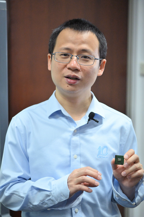 陈云霁展示其团队研制的国际首个深度学习处理器芯片“寒武纪1号”。新华社记者李鑫摄