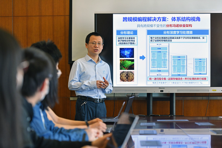 陈云霁(右一)与科研团队成员讨论设计方案。新华社记者李鑫摄