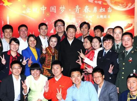 2013年5月4日,习近平来到中国航天科技集团公司中国空间技术研究院,同各界优秀青年代表座谈并发表重要讲话。图为座谈会前,习近平和在展厅参观的优秀青年代表合影。新华社记者 饶爱民 摄