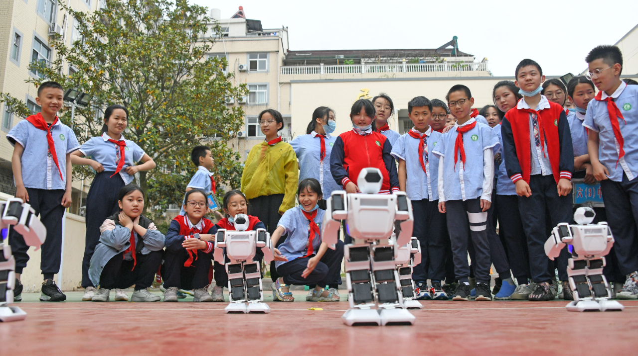 5月9日,仙居县安洲小学的学生正在观看机器人舞蹈表演。