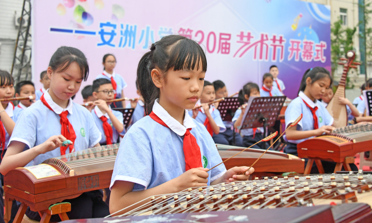 5月9日,仙居县安洲小学的学生正在进行器乐合奏表演。