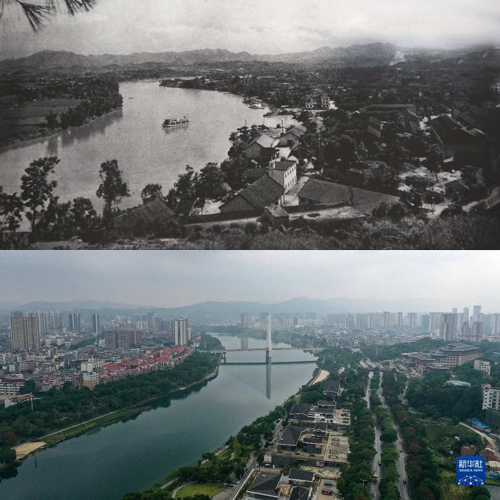 拼版照片:上图为1917年的百色县城(资料图片,百色市档案馆提供);下图为2022年5月8日拍摄的百色市(新华社记者张爱林摄,无人机照片)。