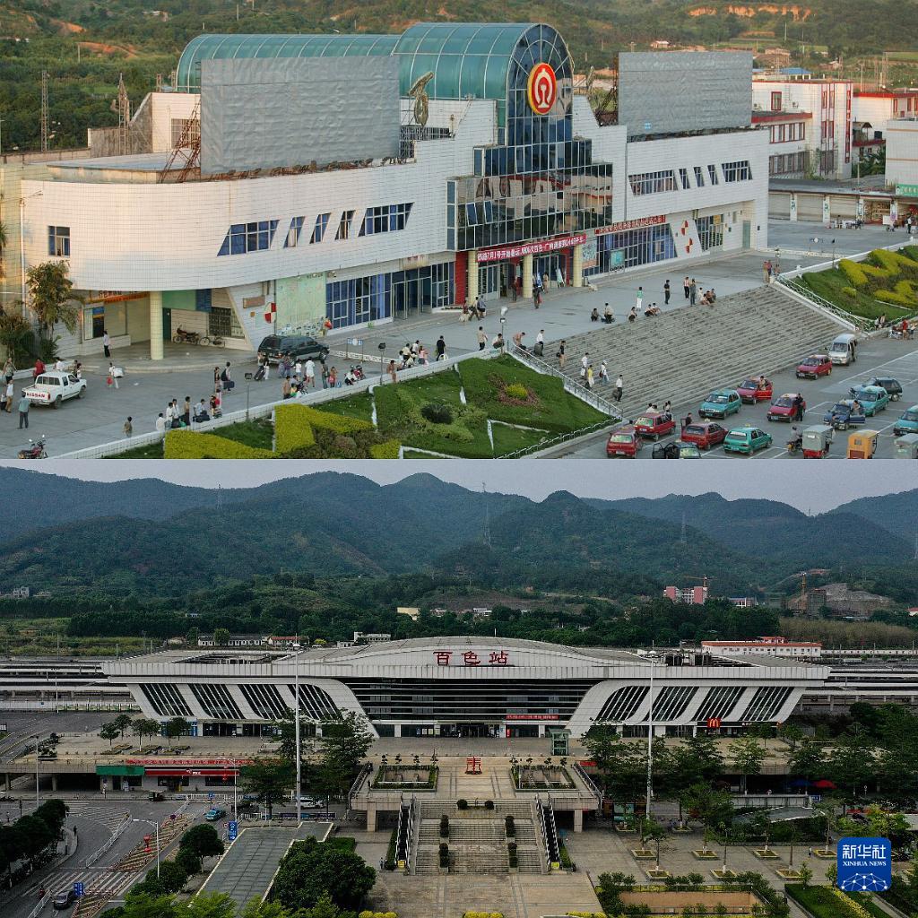拼版照片:上图为1995年的百色市火车站(资料图片,中国铁路南宁局集团有限公司提供);下图为2022年5月7日拍摄的百色市火车站(新华社记者张爱林摄,无人机照片)。