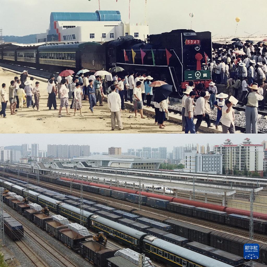 拼版照片:上图为1995年国庆节一列火车开进百色市火车站(资料图片,中国铁路南宁局集团有限公司提供);下图为2022年5月8日拍摄的百色市火车站客货列运行景观(新华社记者张爱林摄,无人机照片)。