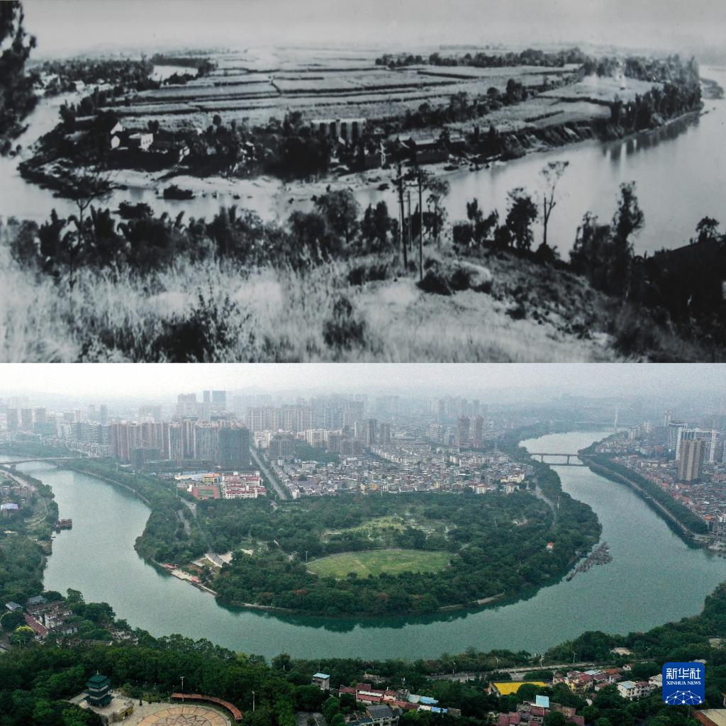 拼版照片:上图为1978年时百色市右江河畔面貌(资料图片,百色市档案馆提供);下图为2022年5月8日拍摄的百色市右江河畔面貌(新华社记者张爱林摄,无人机照片)。