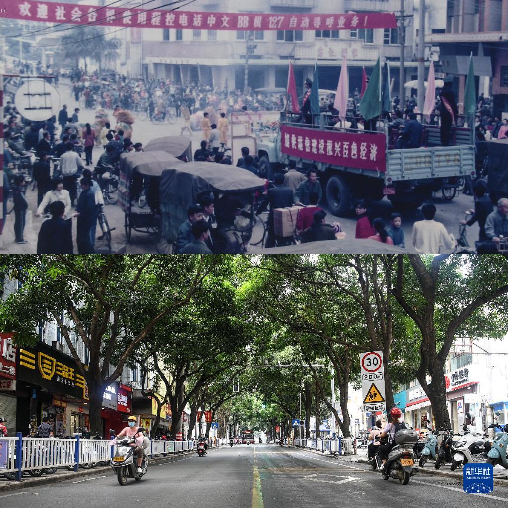 拼版照片:上图为1990年的百色市中山路(资料图片,百色市档案馆提供);下图为2022年5月8日拍摄的百色市中山路(新华社记者张爱林摄)。