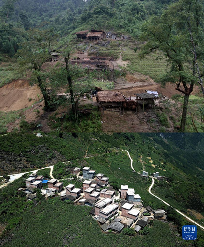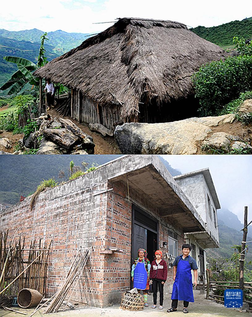 拼版照片:上图为百色市隆林各族自治县金钟山乡平流村坡安屯群众搬迁前的住房(2016年5月24日摄);下图为坡安屯群众易地搬迁到新的安置点后居住的楼房(2019年12月3日摄)。