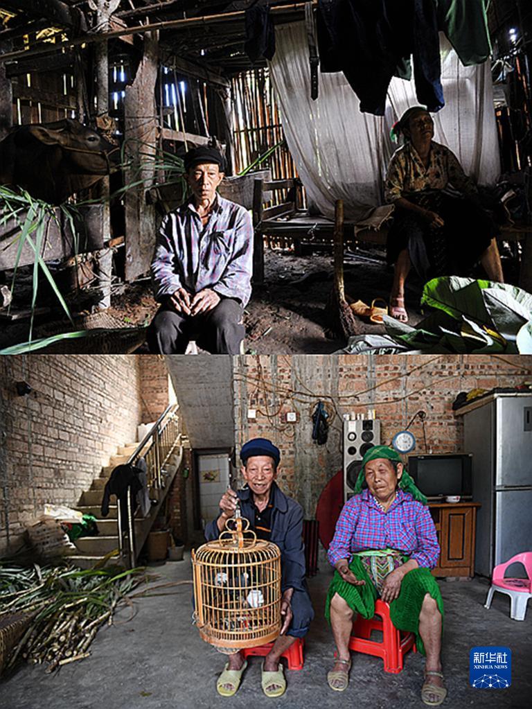 拼版照片:上图为百色市那坡县上保屯村民吴亚路搬迁前的住房(2008年5月26日摄);下图为吴亚路搬迁后居住的楼房(2018年4月24日摄)。