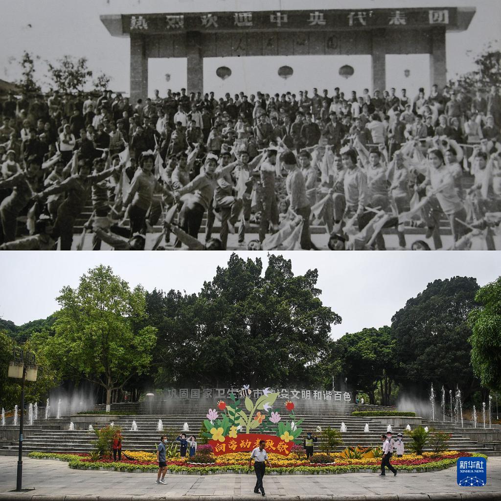 拼版照片:上图为1978年百色市民在人民公园门前庆祝广西壮族自治区成立20周年(资料图片,百色市档案馆提供);下图为2022年5月7日拍摄的百色市人民公园正门(新华社记者张爱林摄)。