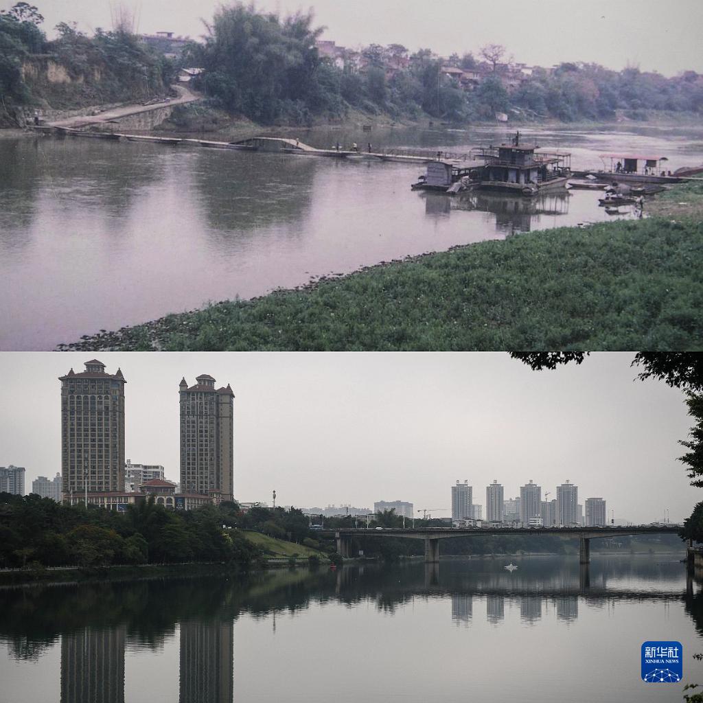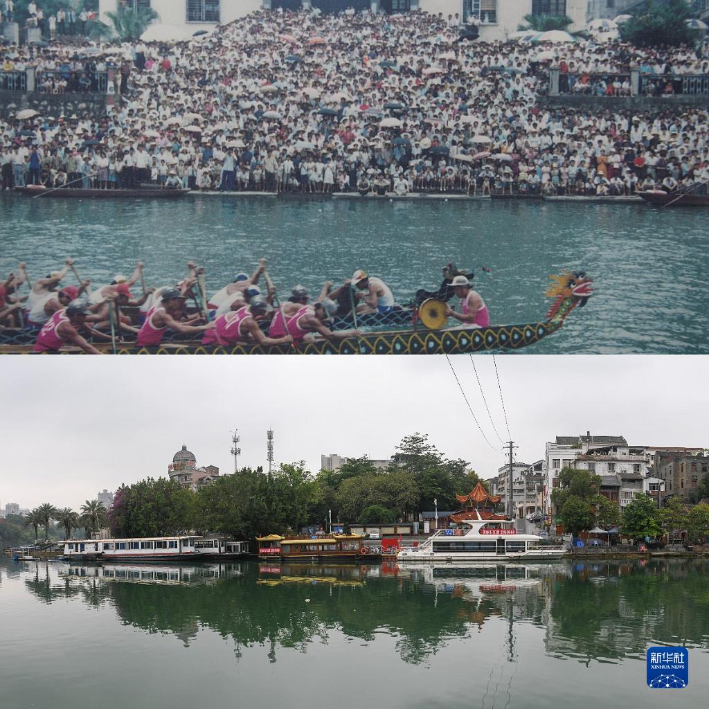 拼版照片:上图为1990年百色市民在老码头赛龙舟(资料图片,百色市档案馆提供);下图为2022年5月8日拍摄的百色市老码头(新华社记者张爱林摄)。