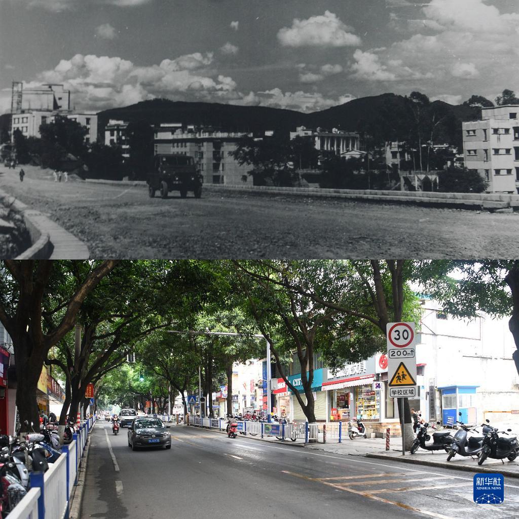 拼版照片:上图为1978年建设中的百色市中山路(资料图片,百色市档案馆提供);下图为2022年5月8日拍摄的百色市中山路(新华社记者张爱林摄)。